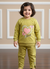 This adorable two-piece outfit is a comfy and cute choice for kids. The set includes a long-sleeve top and matching pants in a soft, striped mustard yellow fabric. The top features a large, textured heart with pink butterflies and the word "Lovely." The pants have a unique button detail on the ankles, adding a stylish touch to this cozy and playful set.